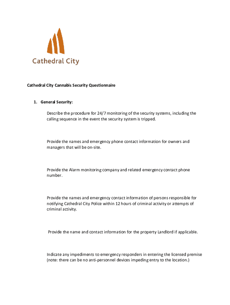 Cathedral City Cannabis Security Questionnaire 1. General Security: Describe the procedure for 24/7 monitoring of the security systems, including the calling sequence in the event the security system