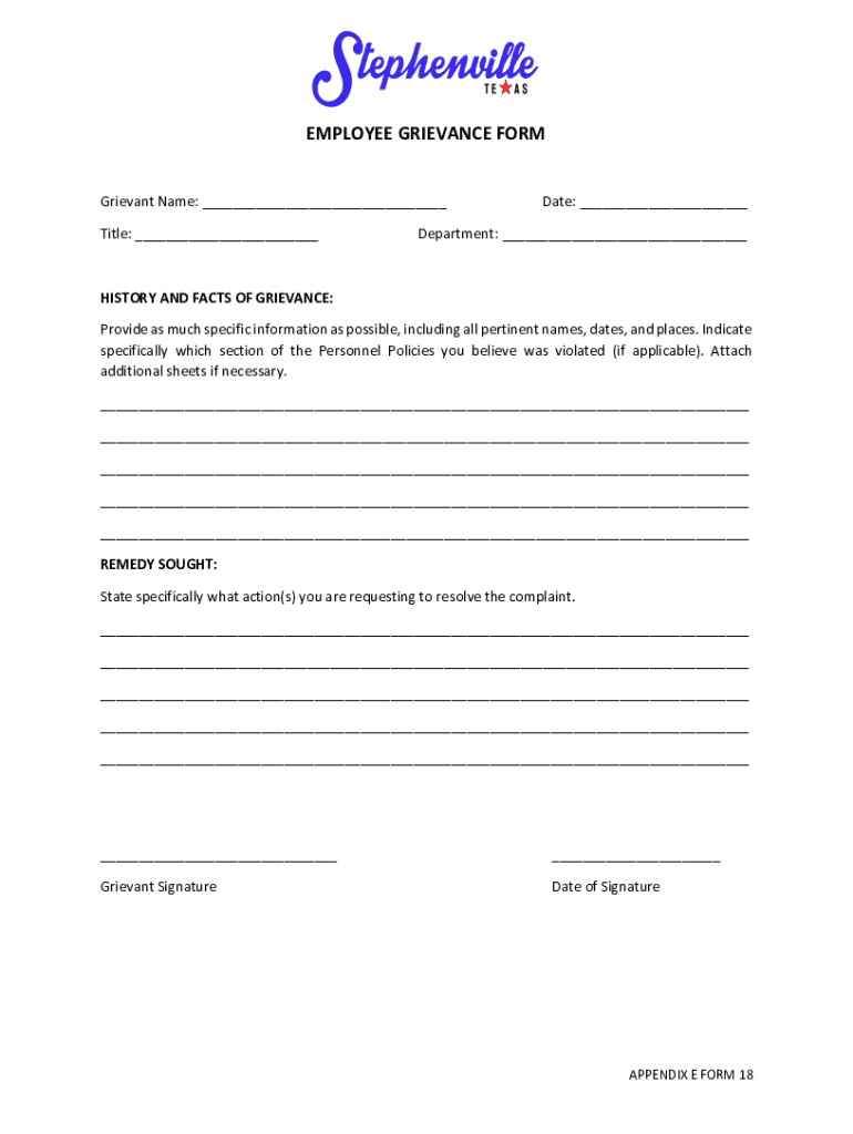 EMPLOYEE GRIEVANCE FORMGrievant Name: ___ Title: ___Date: ___Department: ___HISTORY AND FACTS OF GRIEVANCE: Provide as much specific information as possible, including all pertinent names, dates,