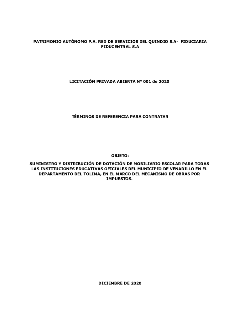 PATRIMONY AUTONOMY P.A. RED DE SERVICES DEL INDIO S. A FIDUCIARY RingCentral S.ELICITATION PRIVATE ALBERTA N 001 de 2020TRMINOS DE REFERENCE PARA CONTRATAROBJETO: MINISTRY Y DISTRIBUTION DE DOMAIN