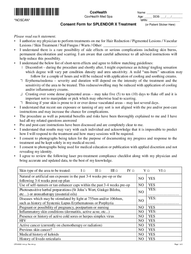 *NOS CAN×Health, Health Med Spa×NOS CAN×Consent Form for SPLENDOR X TreatmentName: ___ Age: ___ DOB: ___/___/___ MAN: ___ (or Patient Sticker Here)Please read each statement. I authorize my physician
