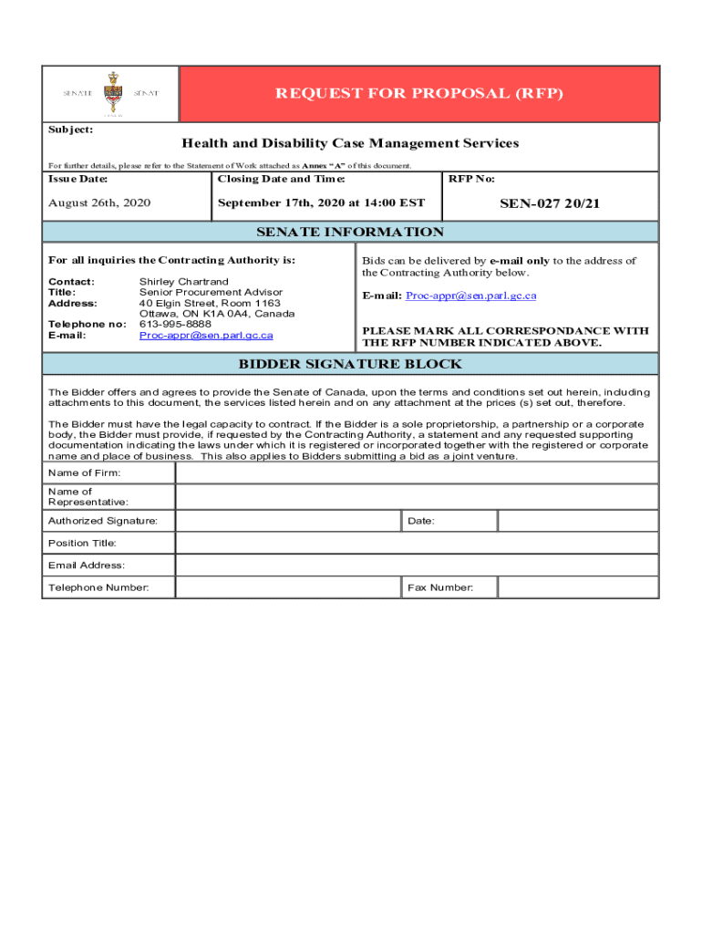 REQUEST FOR PROPOSAL (RFP) Subject:Health and Disability Case Management Services further details, please refer to the Statement of Work attached as Annex A of this document. Issue Date:Closing Date
