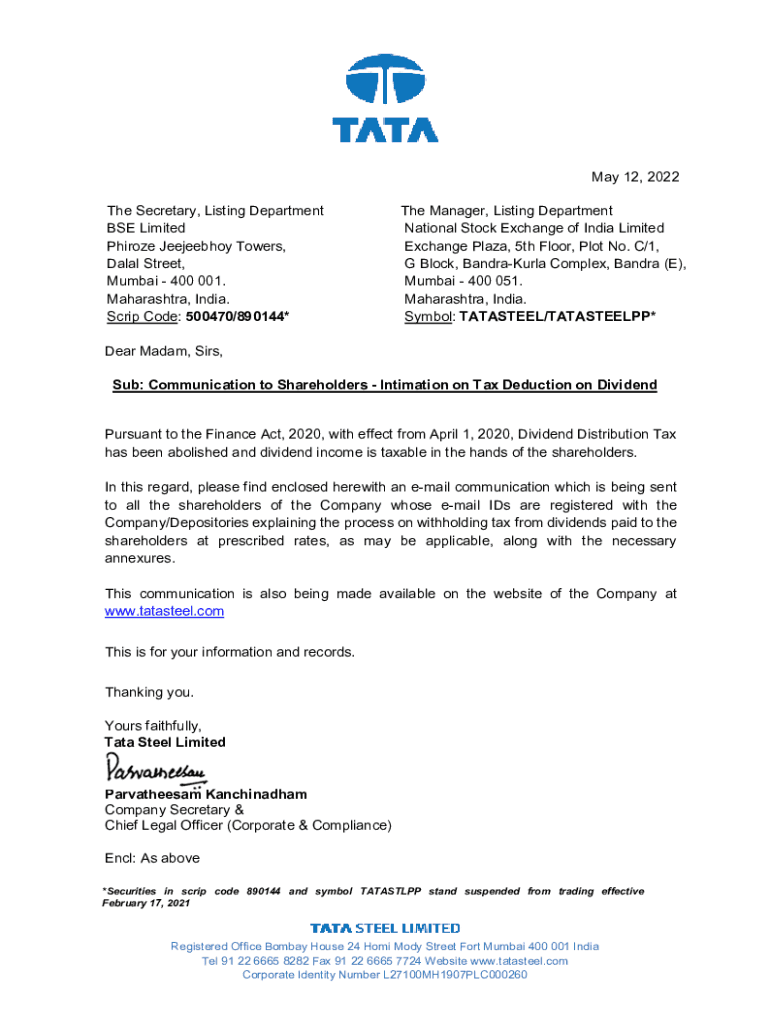 May 12, 2022, The Secretary, Listing Department BSE Limited Phone Jeejeebhoy Towers, Daley Street, Mumbai 400 001. Maharashtra, India. Scrip Code: 500470/890144×The Manager, Listing Department National
