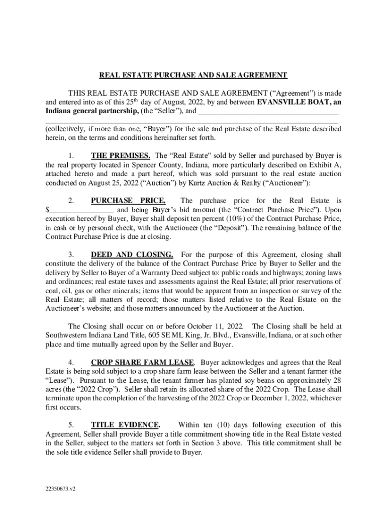 REAL ESTATE PURCHASE AND SALE AGREEMENT THIS REAL ESTATE PURCHASE AND SALE AGREEMENT (Agreement) is made and entered into as of this 25th day of August 2022, by and between EVANSVILLE BOAT, an Indiana