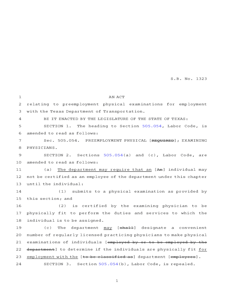 S.B.ANO. A1323AN ACT1 2relatingtopreemploymentphysicalexaminations3with the Texas Department of Transportation.foremployment4BE IT ENACTED BY THE LEGISLATURE OF THE STATE OF TEXAS:5SECTIONA1. Bathe
