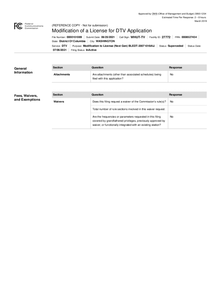 Approved by OMB (Office of Management and Budget) 30601254 Estimated Time Per Response: 2 8 hours March 2019(REFERENCE COPY Not for submission)Modification of a License for DTV Application File Number: