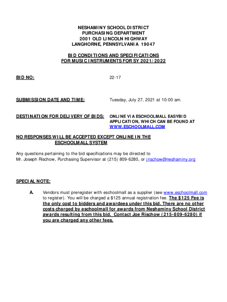 RESHAPING SCHOOL DISTRICT PURCHASING DEPARTMENT 2001 OLD LINCOLN HIGHWAY LANGHORNE, PENNSYLVANIA 19047 BID CONDITIONS AND SPECIFICATIONS FOR MUSIC INSTRUMENTS FOR SY 2021/2022 BID NO:2217SUBMISSION