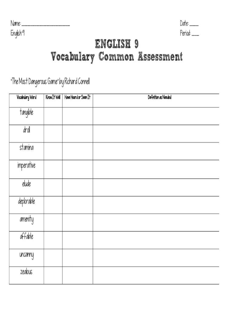 Name: ___ English 9Date: ___ Period: ___ENGLISH 9 Vocabulary Common Assessment Most Dangerous Game by Richard Connell Vocabulary Word tangible droll stamina imperative elude deplorable amenity affable