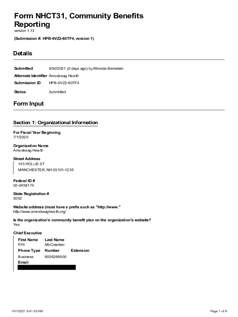 Form NHCT31, Community Benefits Reporting version 1.13(Submission #: HPB0VZ260TF4, version 1)Details Submitted9/30/2021 (0 days ago) by Rhonda BernsteinAlternate Identifier Muskeg Heath Submission