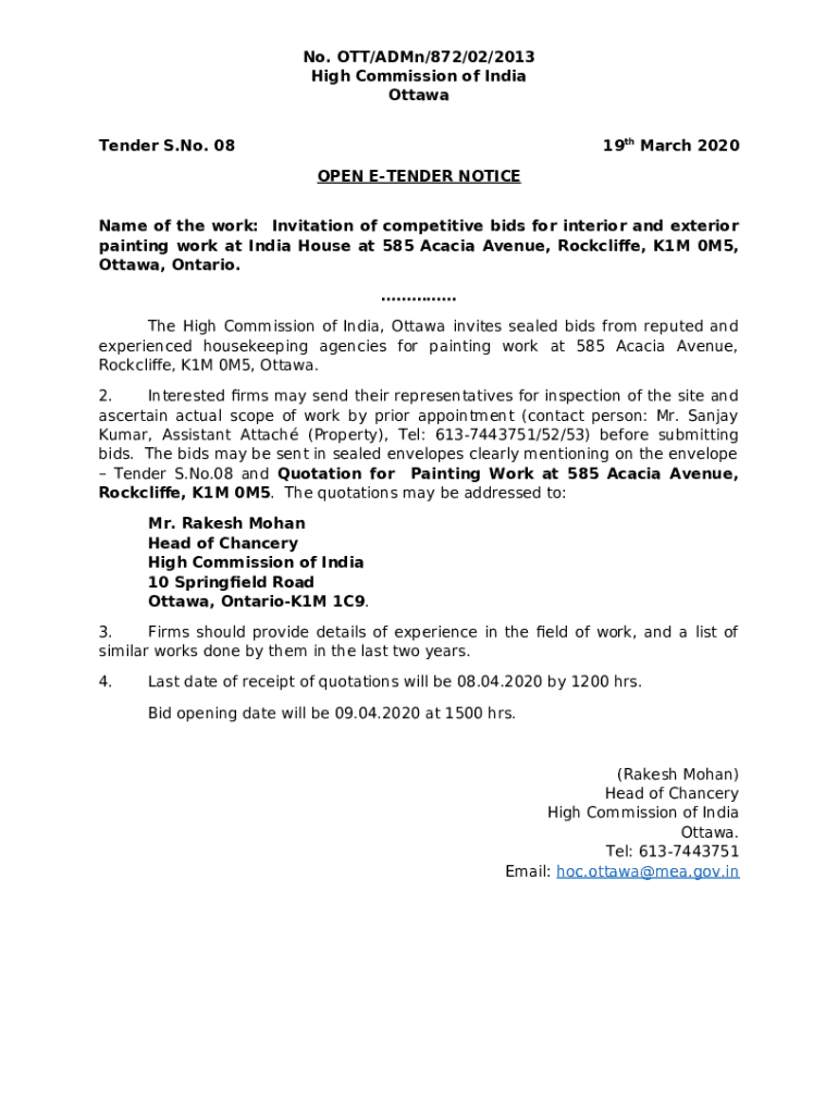 No. OUT/Aden/872/02/2013 High Commission of India Ottawa 19th March 2020Tender S. No. 08 OPEN TENDER Nickname of the work: Invitation of competitive bids for interior and exterior painting work at