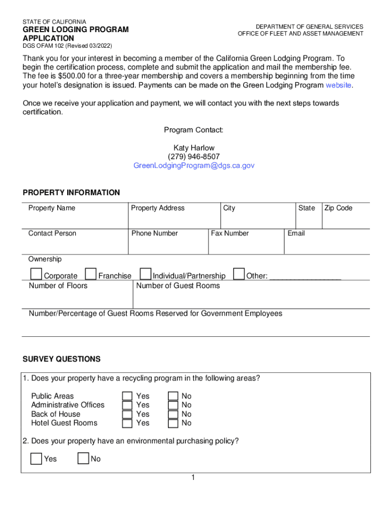 STATE OF CALIFORNIADEPARTMENT OF GENERAL SERVICES OFFICE OF FLEET AND ASSET MANAGEMENTGREEN LODGING PROGRAM APPLICATION DGS FAM 102 (Revised 03/2022)Thank you for your interest in becoming a member