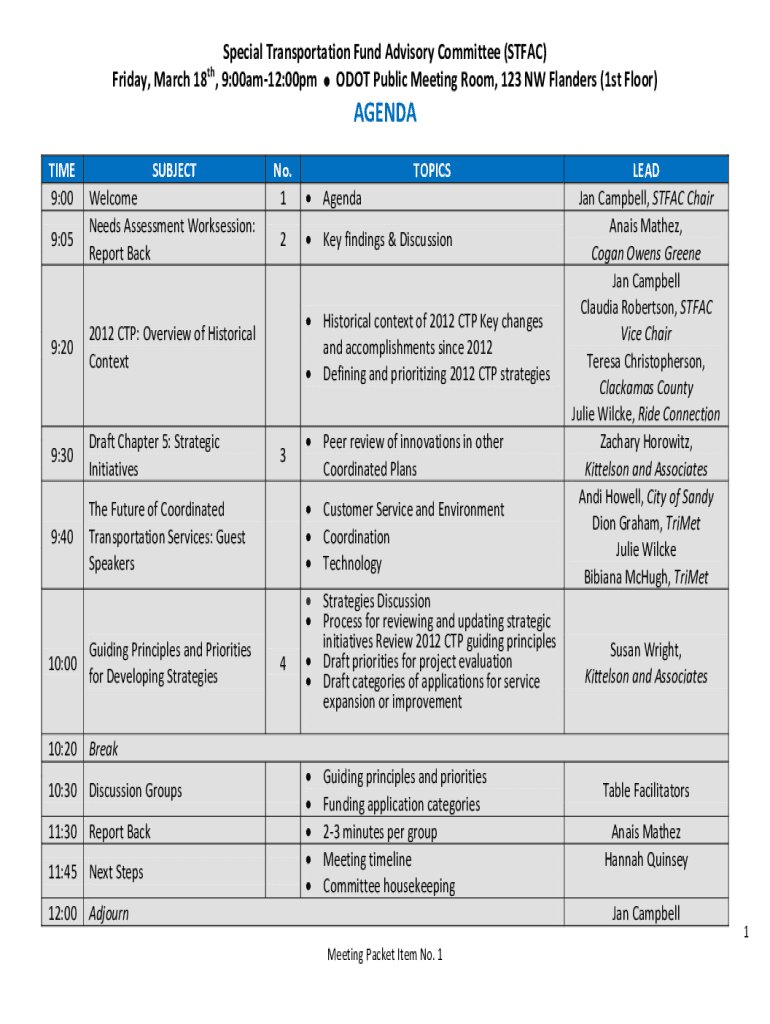 Special Transportation Fund Advisory Committee (ST FAC) Friday, March 18, 9:00am12:00pm DOT Public Meeting Room, 123 NW Flanders (1st Floor) agenda TIME 9:00 9:05SUBJECT Welcome Needs Assessment Work