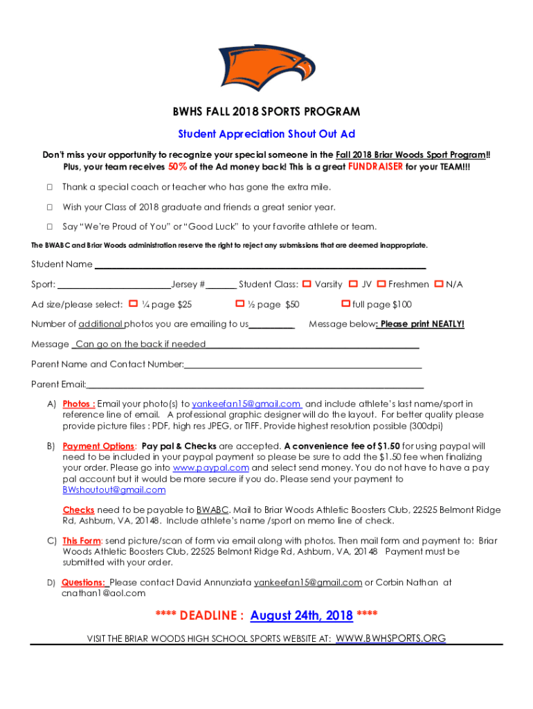 BHS FALL 2018 SPORTS PROGRAM Student Appreciation Shout Out Ad Don't miss your opportunity to recognize your special someone in the Fall 2018 Brian Woods Sport Program!! Plus, your team receives 50%