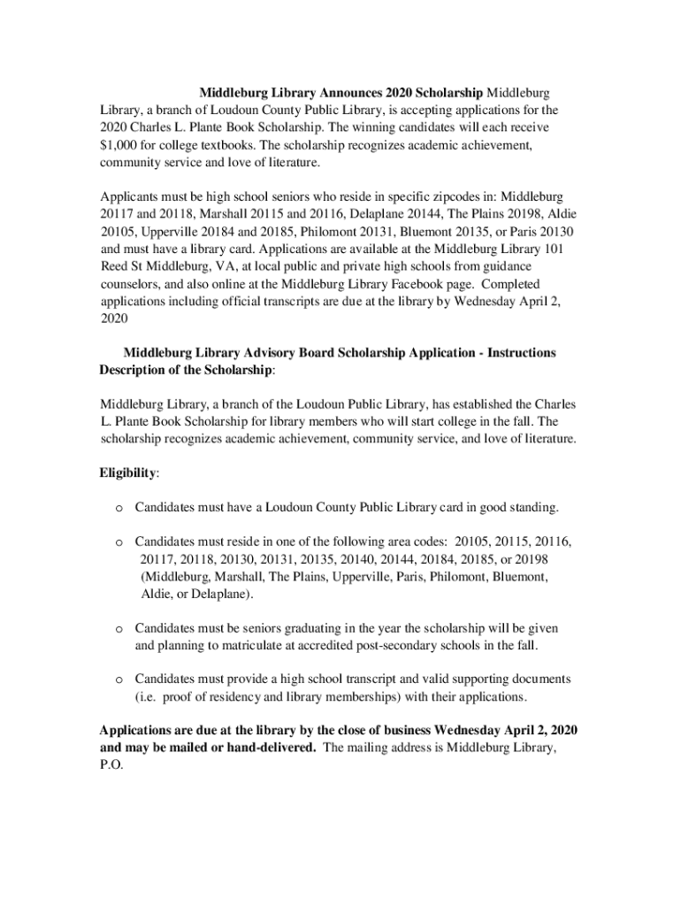 Middle burg Library Announces 2020 Scholarship Middle burg Library, a branch of Loudoun County Public Library, is accepting applications for the 2020 Charles L. Plant Book Scholarship. The winning