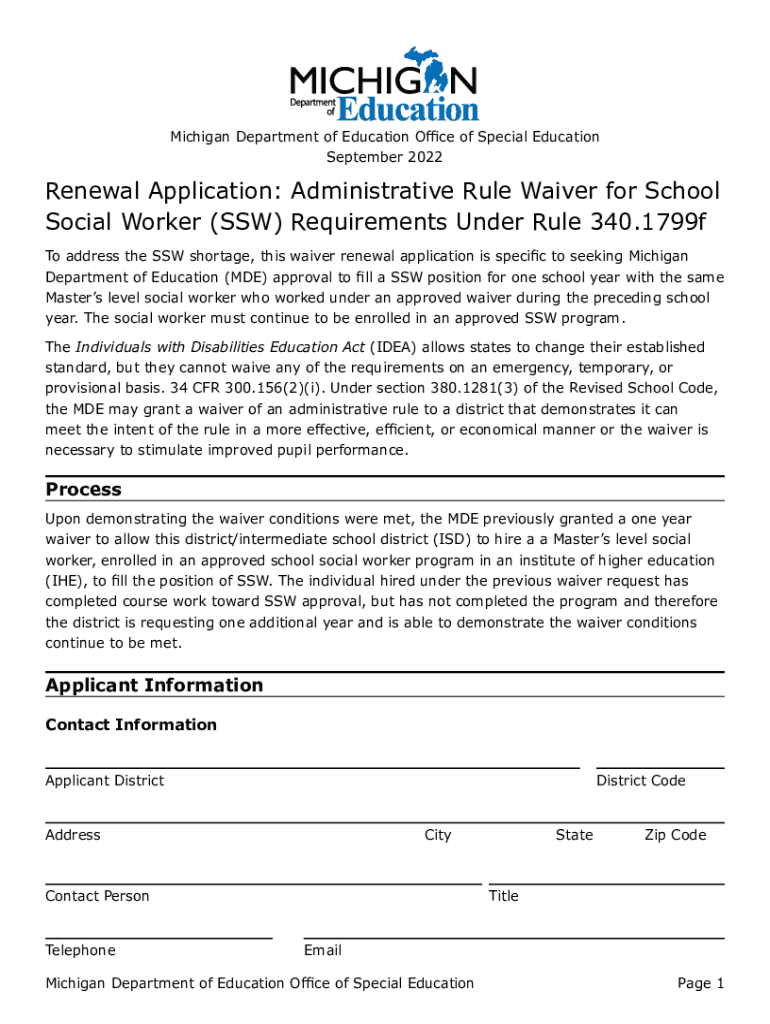Michigan Department of Education Office of Special Education September 2022Renewal Application: Administrative Rule Waiver for School Social Worker (SSW) Requirements Under Rule 340.1799f To address