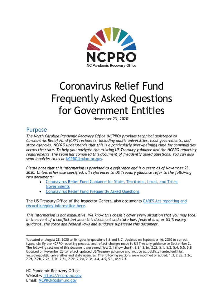 Coronavirus Relief Fund Frequently Asked Questions for Government Entities November 23, 2020 1Purpose The North Carolina Pandemic Recovery Office (NC PRO) provides technical assistance to Coronavirus