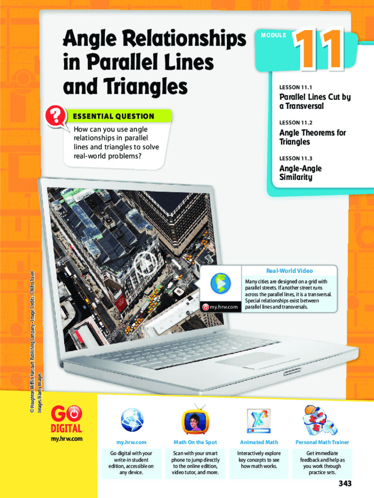 Angle Relationships in Parallel Lines and Triangles ?MODULE11LESSON 11.1Parallel Lines Cut by a TransversalESSENTIAL QUESTIONLESSON 11.2How can you use angle relationships in parallel lines and triangles