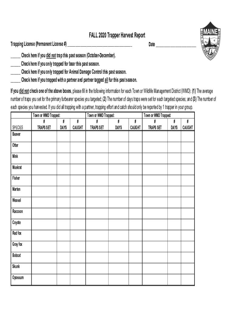FALL 2020 Trapper Harvest Report Trapping License (Permanent License #) ___Date ______ Check here if you did not trap this past season (October December). ___ Check here if you only trapped for bear