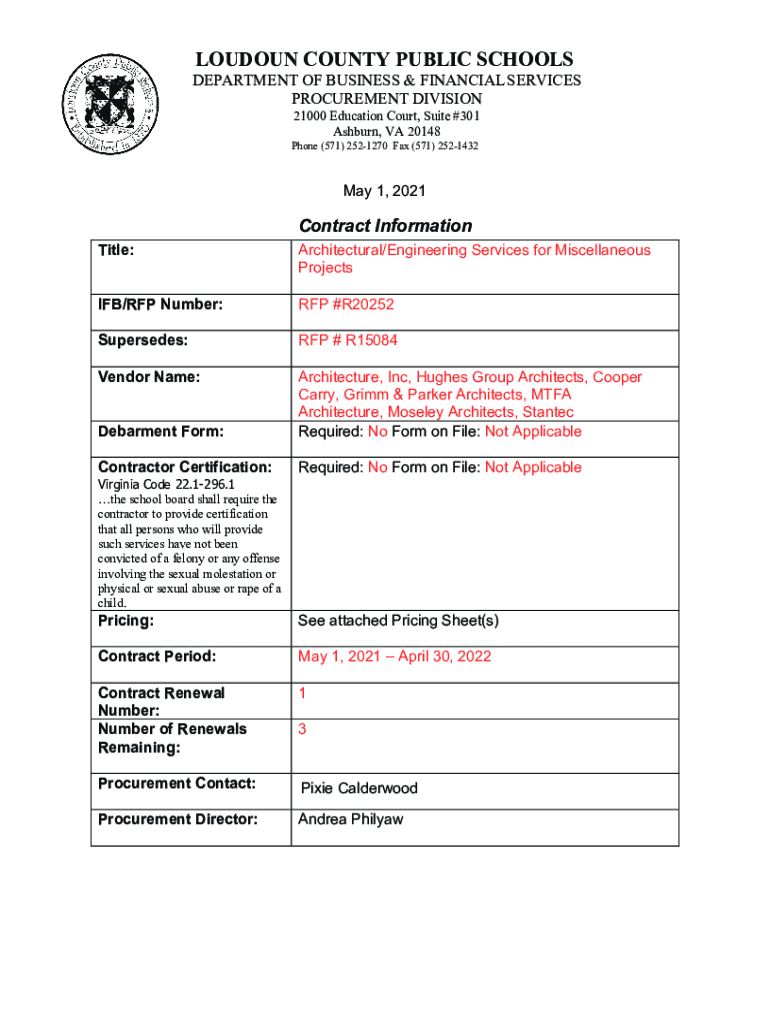LOUDOUN COUNTY PUBLIC SCHOOLS DEPARTMENT OF BUSINESS & FINANCIAL SERVICES PROCUREMENT DIVISION 21000 Education Court, Suite #301 Ashburn, VA 20148 Phone (571) 2521270 Fax (571) 2521432May 1, 2021Contract