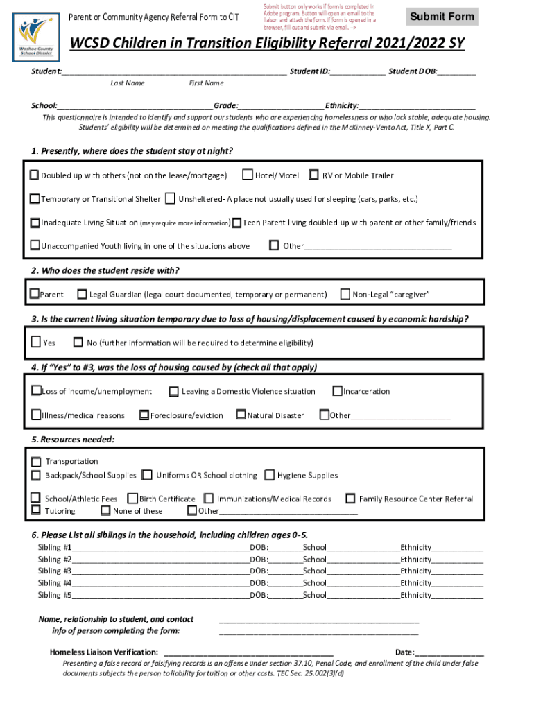 Submit button only works if form is completed in Adobe program. Button will open an email to the liaison and attach the form. If form is opened in a browser, fill out and submit via email. Parent
