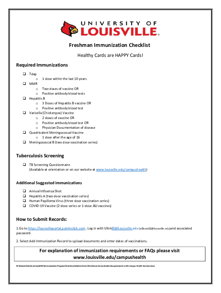 Get the free Freshman Immunization Checklist - University of Louisville