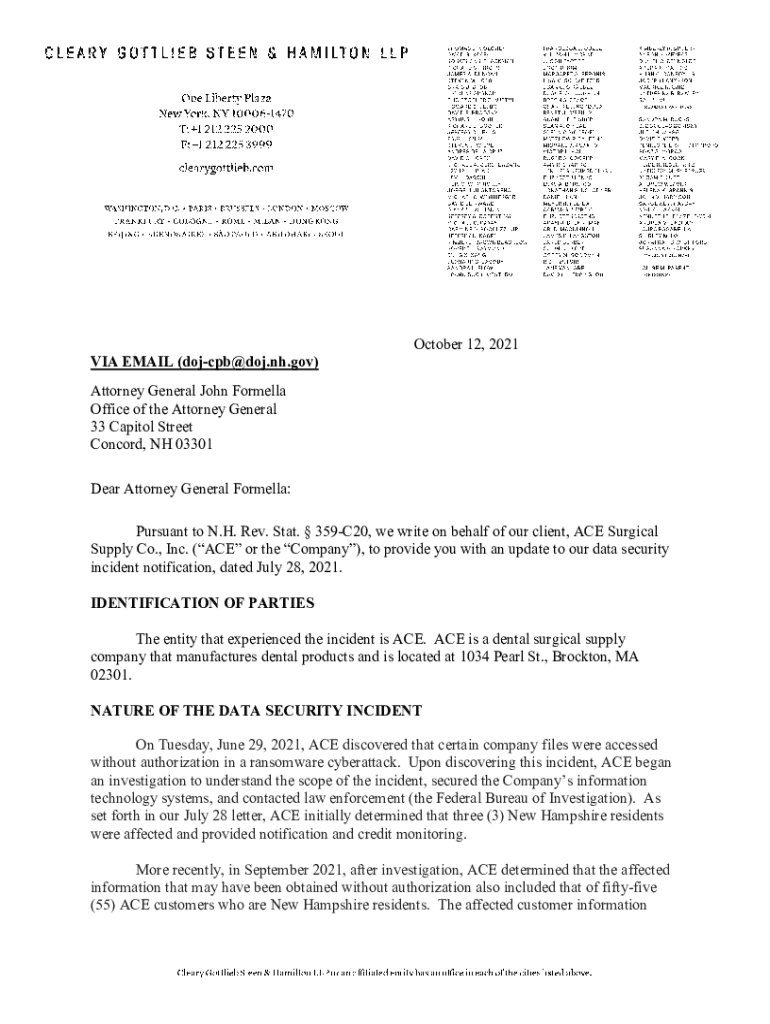 October 12, 2021, VIA EMAIL (dojcpb@doj.nh.gov) Attorney General John Formerly Office of the Attorney General 33 Capitol Street Concord, NH 03301 Dear Attorney General Formerly: Pursuant to N.H. Rev.