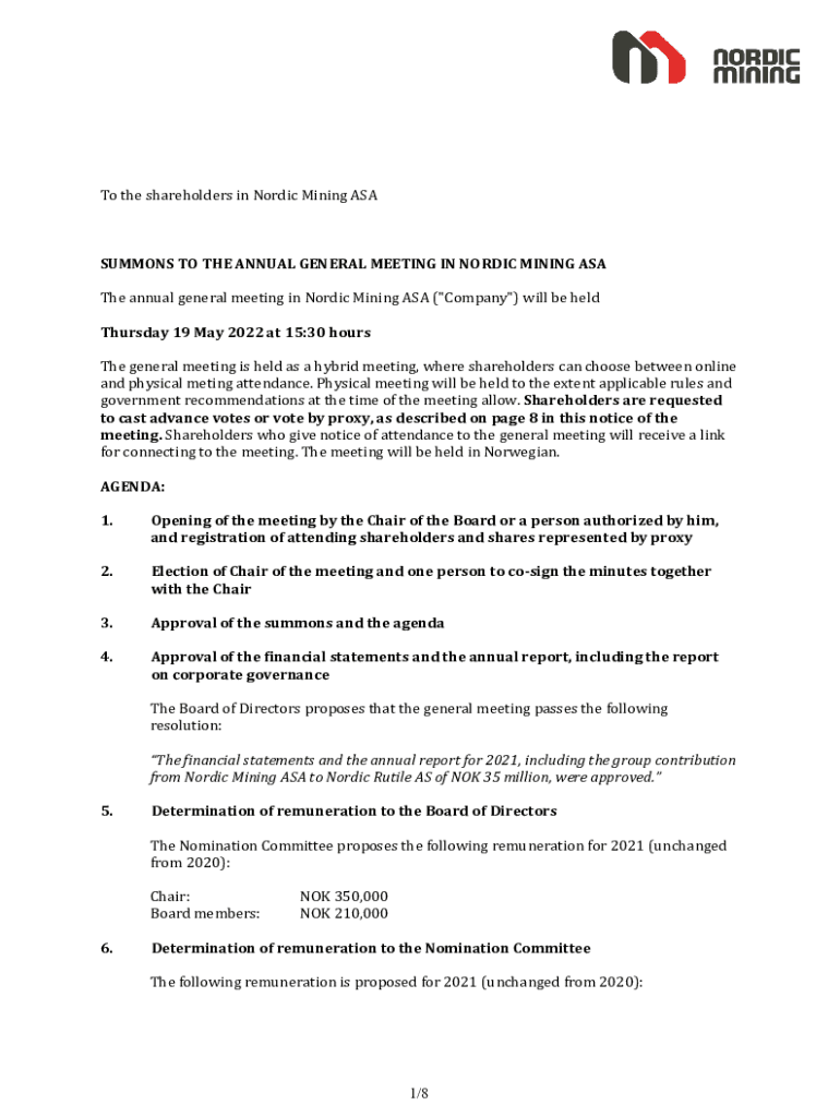 To the shareholders in Nordic Mining ASA SUMMONS TO THE ANNUAL GENERAL MEETING IN NORDIC MINING ASA The annual general meeting in Nordic Mining ASA (\” Company\”) will be held Thursday 19 May