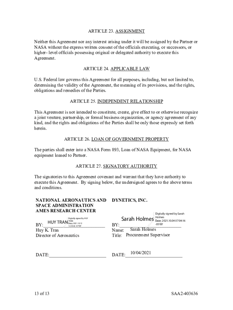 REIMBURSABLE SPACE ACT UMBRELLA AGREEMENT BETWEEN THE NATIONAL AERONAUTICS AND SPACE ADMINISTRATION AMES RESEARCH CENTER AND DYNAMICS, INC. FOR WIND TUNNEL TESTING ARTICLE 1. AUTHORITY AND PARTIES
