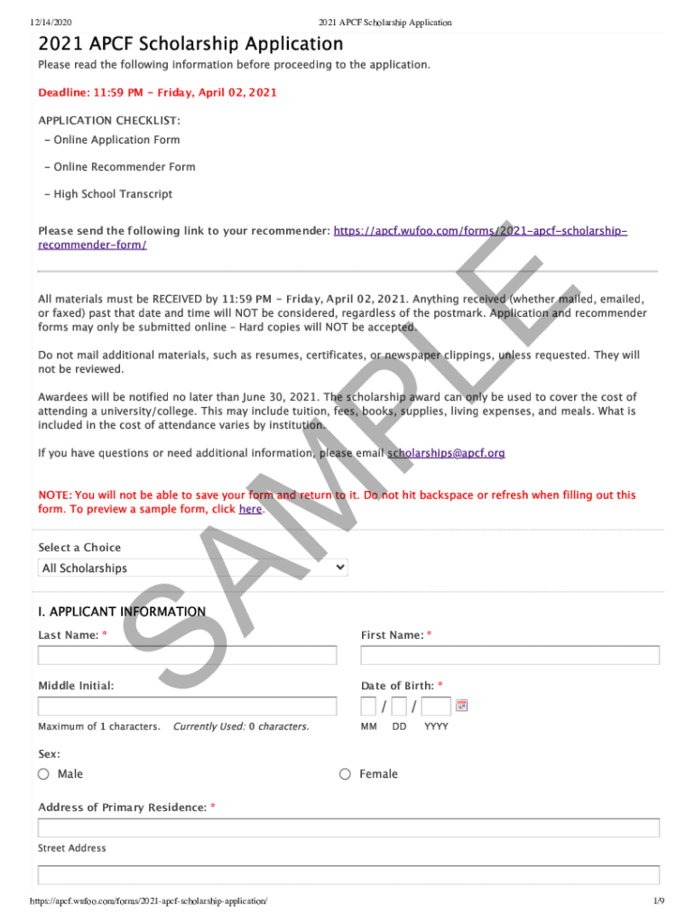 12/14/20202021 APC Scholarship Application2021 APC Scholarship ApplicationPlease read the following information before proceeding to the application. Deadline: 11:59 PM Friday, April 02, 2021, APPLICATION