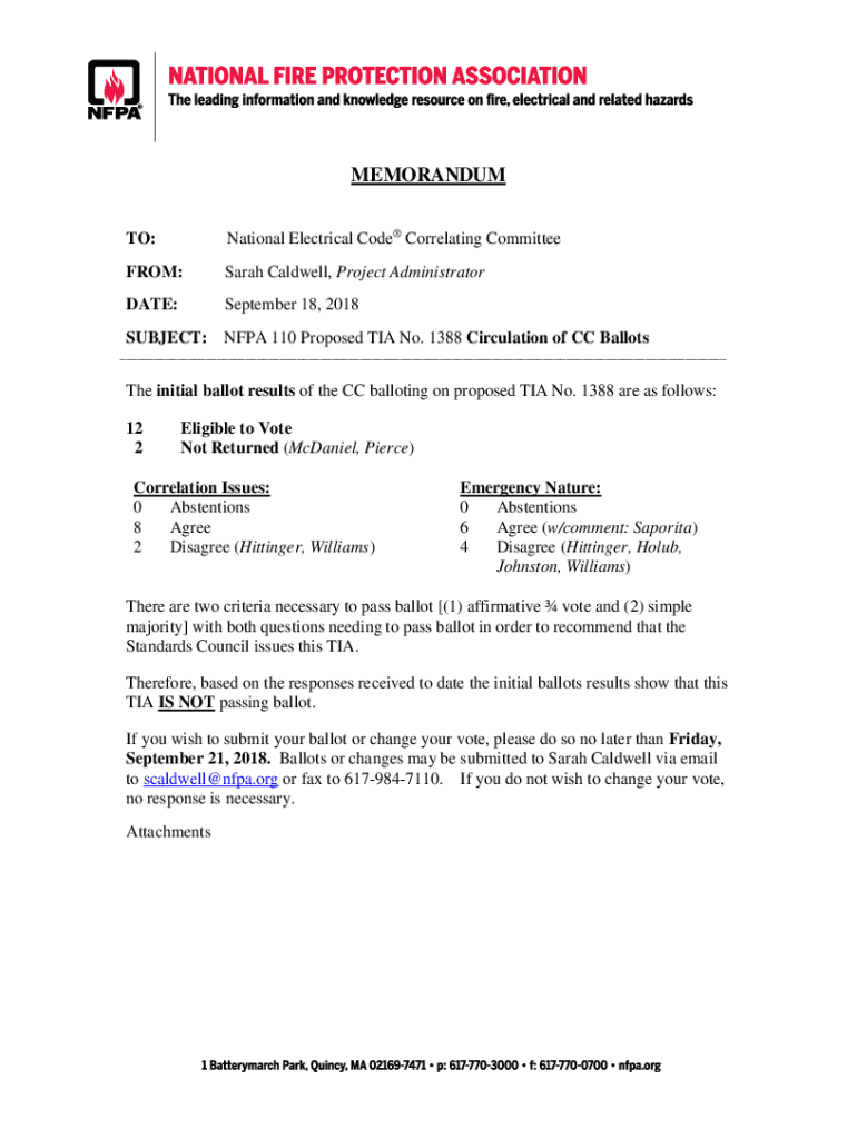 MEMORANDUM TO:National Electrical Code Correlating CommitteeFROM:Sarah Caldwell, Project AdministratorDATE:September 18, 2018SUBJECT: NFPA 110 Proposed TIA No. 1388 Circulation of CC Ballots ___The