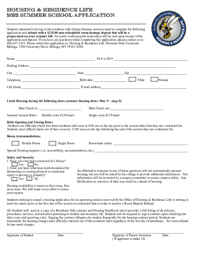 Housing & Residence Life 2022 Summer School Application Students interested in living in the residence halls during Summer sessions need to complete the following application and submit with a $125.00