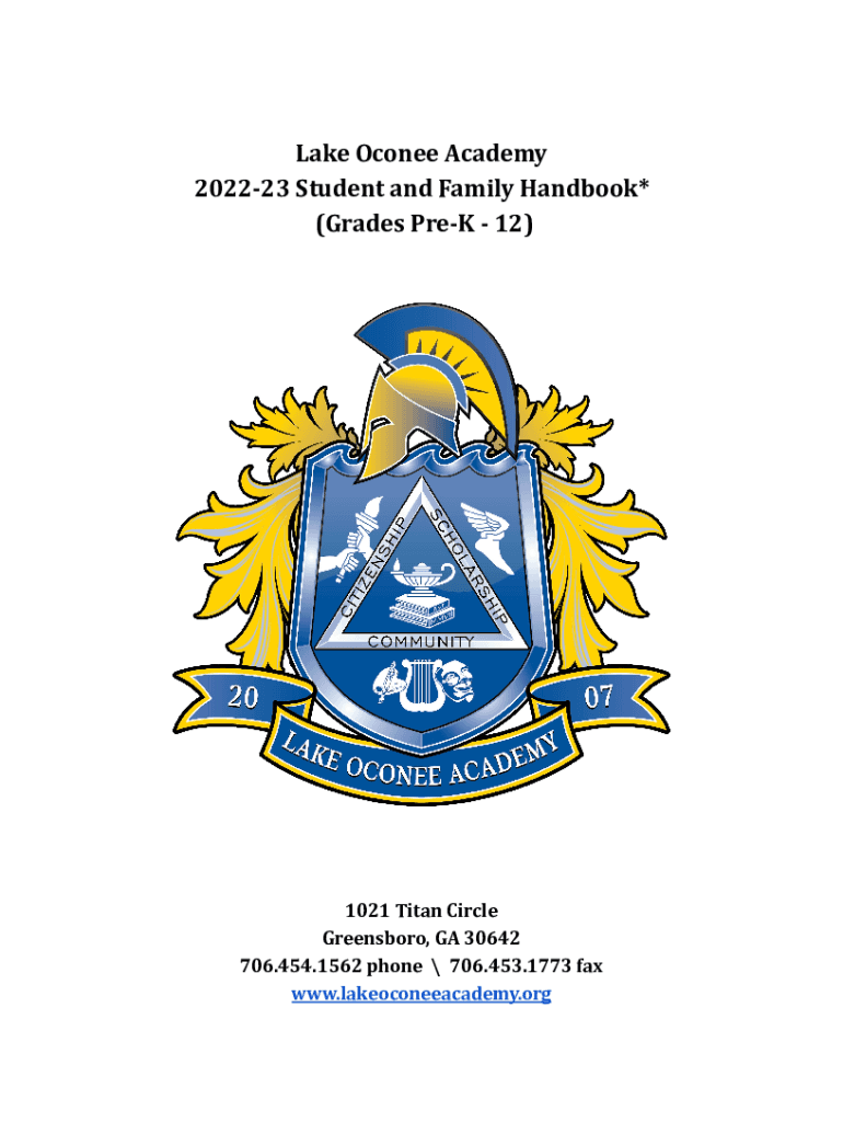 Lake Ocoee Academy 202223 Student and Family Handbook* (Grades Prey 12)1021 Titan Circle Greensboro, GA 30642 706.454.1562 phone 706.453.1773 fax www.lakeoconeeacademy.org×CAVEAT This handbook is