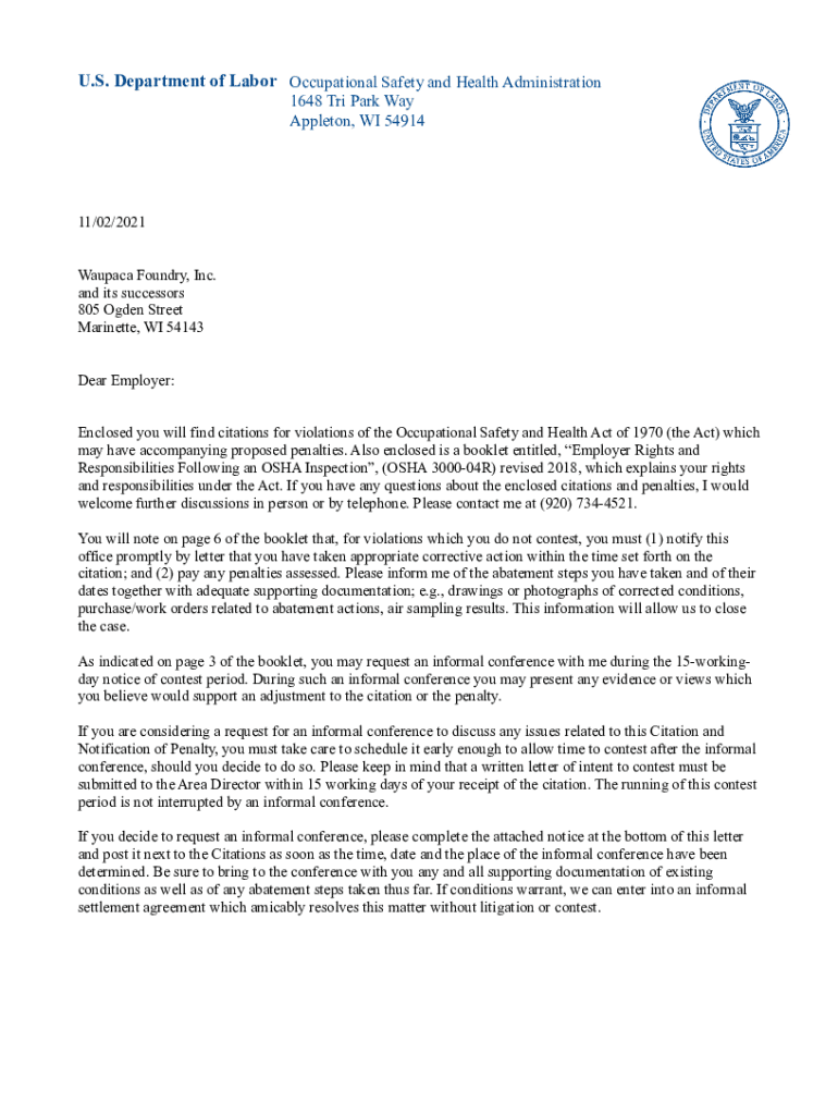 U.S. Department of Labor Occupational Safety and Health Administration 1648 TRI Park Way Appleton, WI 5491411/02/2021 Alpaca Foundry, Inc. and its successors 805 Ogden Street Marionette, WI 54143