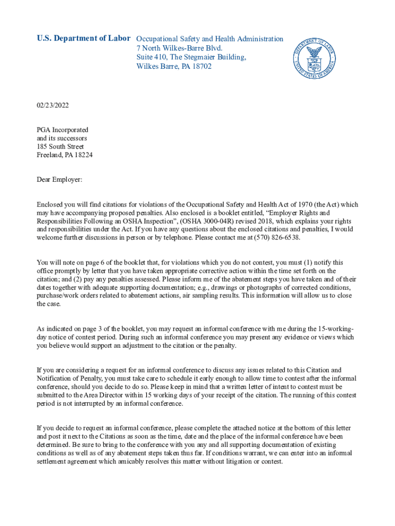 U.S. Department of Labor Occupational Safety and Health Administration 7 North WilkesBarre Blvd. Suite 410, The Steamier Building, Wilkes Barre, PA 1870202/23/2022 PGA Incorporated and its successors