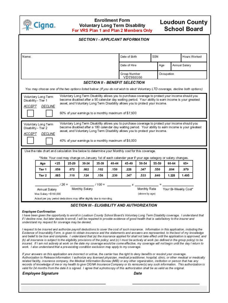 Enrollment Form Voluntary Long Term DisabilityLoudoun County School Boarder VRS Plan 1 and Plan 2 Members Only SECTION I APPLICANT Informational:Date of BirthSSNHours Workmate of HireAgeGroup NumberOccupationVDT980100