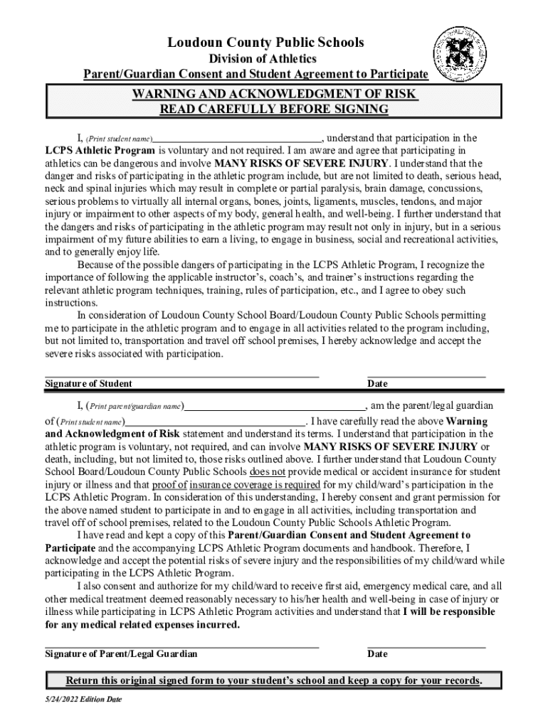 Loudoun County Public SchoolsDivision of Athletics Parent/Guardian Consent and Student Agreement to Participate WARNING AND ACKNOWLEDGMENT OF RISK READ CAREFULLY BEFORE SIGNING I, (Print student name),