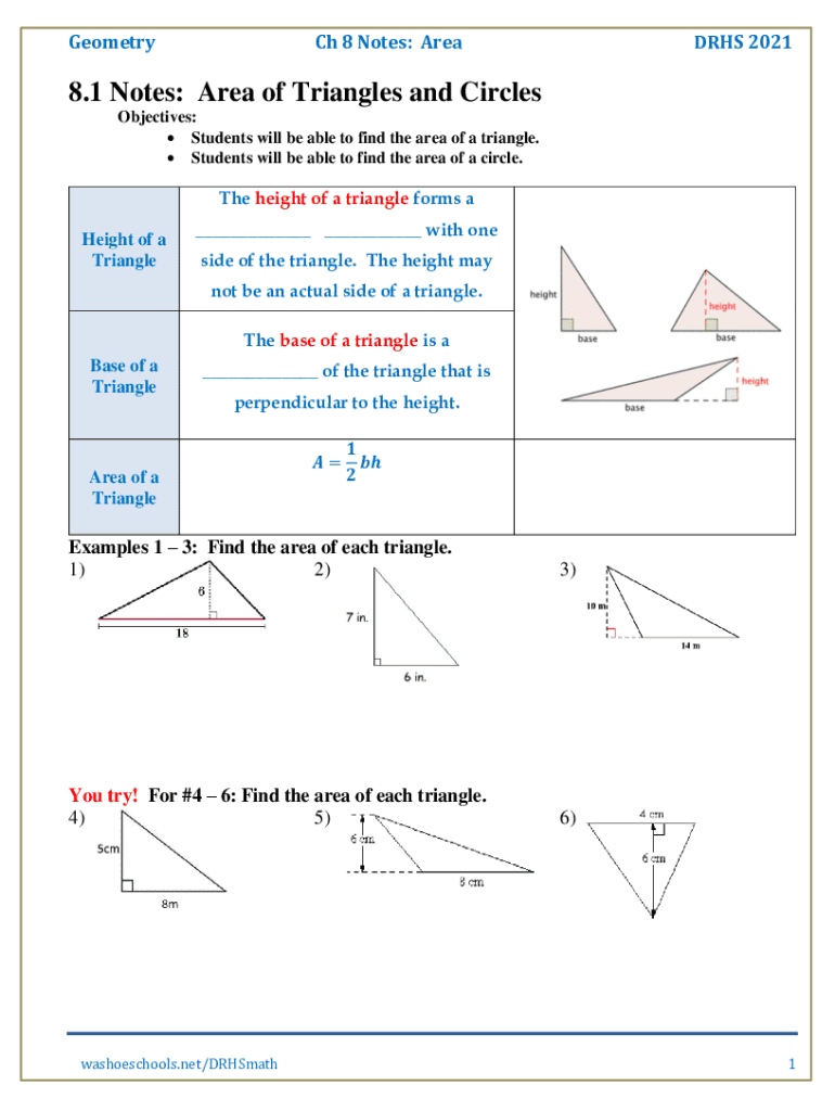 Geometry Ch 8 Notes: Breadths 20218.1 Notes: Area of Triangles and Circles Objectives: Students will be able to find the area of a triangle. Students will be able to find the area of a circle. The