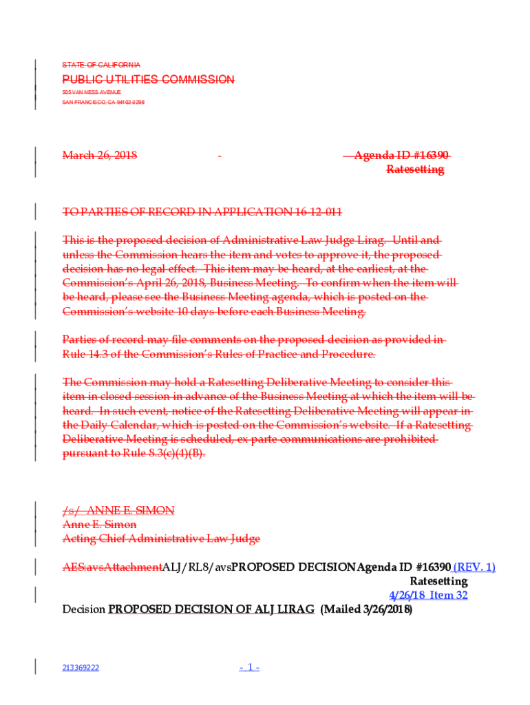 STATE OF CALIFORNIAPUBLIC UTILITIES COMMISSION 505 VAN LESS AVENUE SAN FRANCISCO, CA 941023298March 26, 2018Agenda ID #16390 RatesettingTO PARTIES OF RECORD IN APPLICATION 1612011 This is the proposed