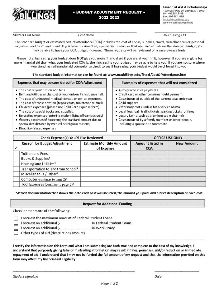 Financial Aid & Scholarships 1500 University Dr. Billings, MT 59101 PH: 406.657.2188 Fax: 406.657.1789 finaid@msubillings.edu www.msubillings.edu/finaid BUDGET ADJUSTMENT REQUEST 20222023 ___ Student