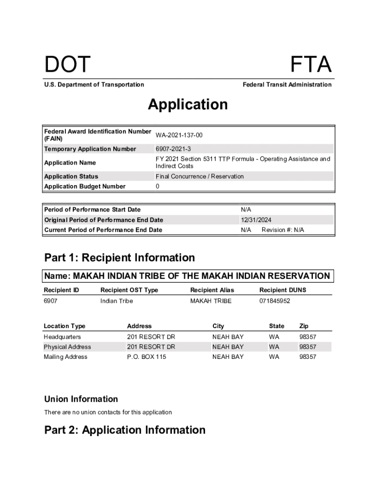 DOTTED. S. Department of Transportation Federal Transit AdministrationApplication Federal Award Identification Number WA202113700 (FAIN) Temporary Application Number690720213Application Namely 2021