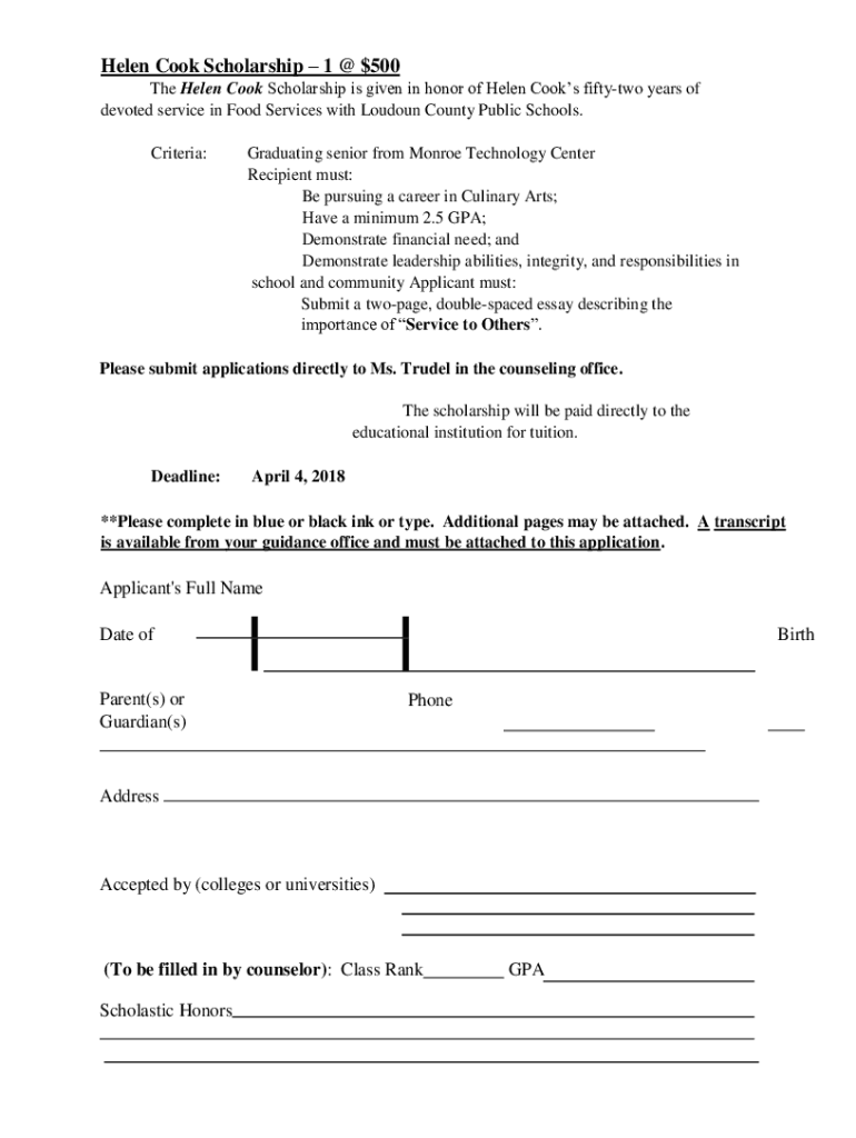 Helen Cook Scholarship 1 @ $500 The Helen Cook Scholarship is given in honor of Helen Cooks fifty-two years of devoted service in Food Services with Loudoun County Public Schools. Criteria:Graduating