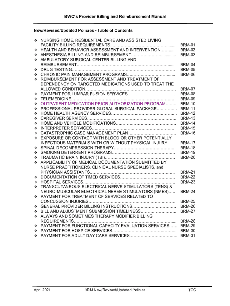 BWC's Provider Billing and Reimbursement Manual New/Revised/Updated Policies Table of Contents NURSING HOME, RESIDENTIAL CARE AND ASSISTED LIVINGFACILITY BILLING REQUIREMENTS..........BRM01 BRM02