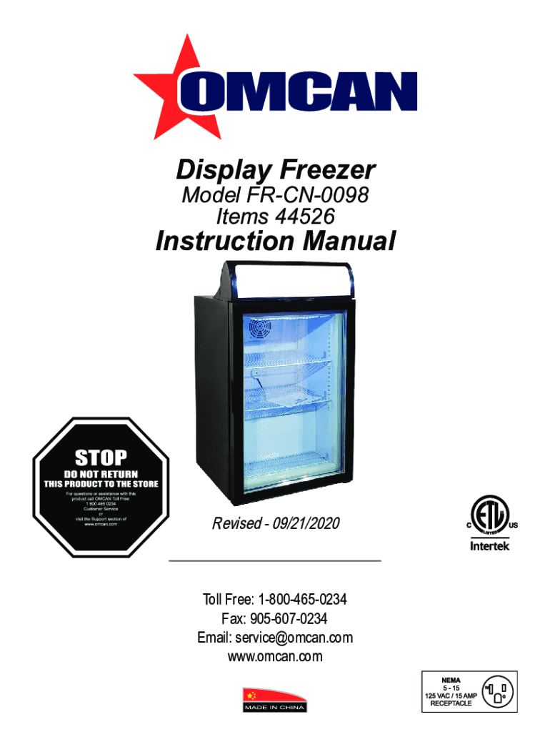Display Freezer Model FRCN0098 Items 44526Instruction ManualRevised 09/21/2020Toll Free: 18004650234 Fax: 9056070234 Email: service@omcan.com www.omcan.comTable of Contents Model FRCN0098 SectionPageGeneral