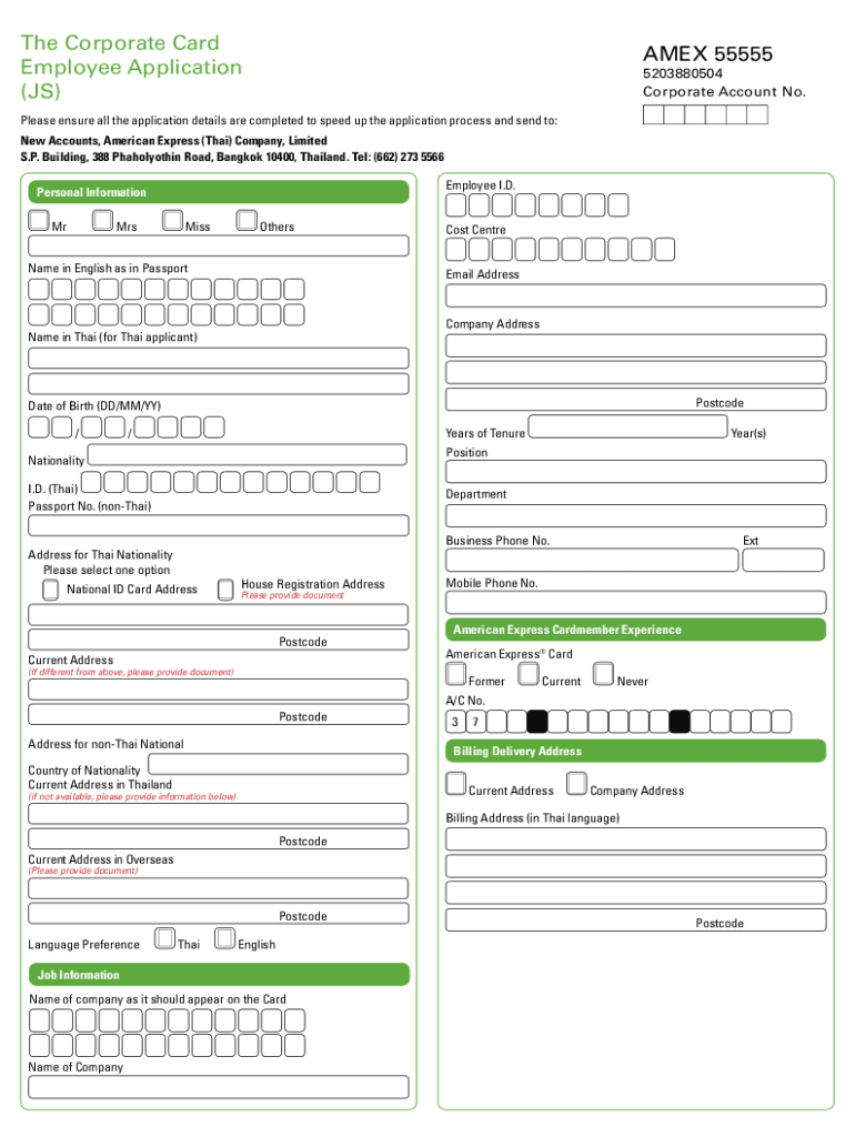 GLOBAL COMMERCIAL SERVICESAMERICAN EXPRESSCorporate Card Employee Application Joint and Several Liability Thailand Corporate Card Employee Application (JS)AMEX 555555203880504 Corporate Account No.