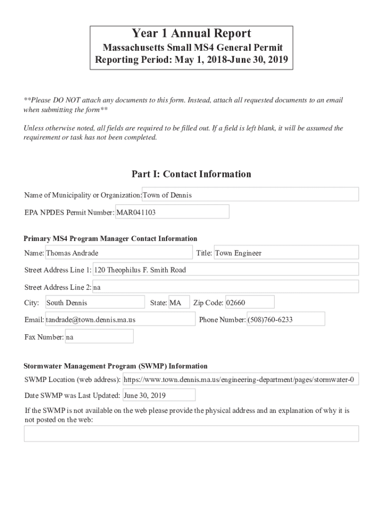 Year 1 Annual Report Massachusetts Small MS4 General Permit Reporting Period: May 1, 2018June 30, 2019**Please DO NOT attach any documents to this form. Instead, attach all requested documents to