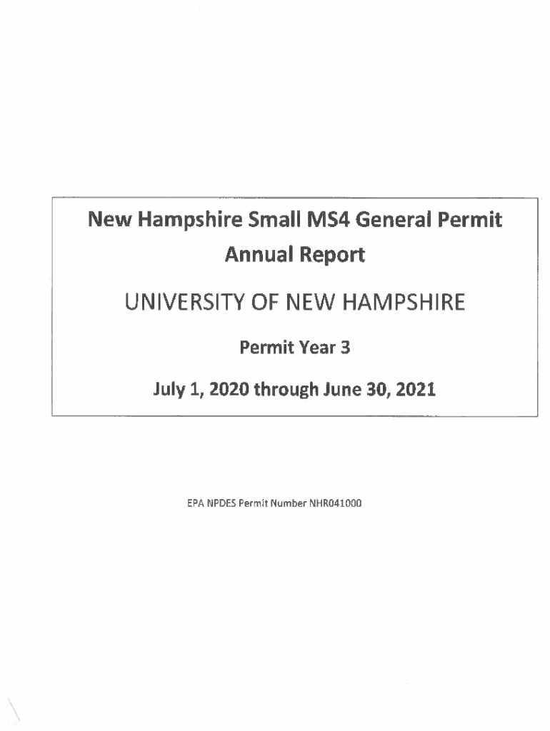 New Hampshire Small MS4 General Permit Annual ReportUNIVERSITY OF NEW HAMPSHIRE Permit Are 3 July 1, 2020, through June 30, 2021EPA NODES Permit Number NHR041000Authorized Representative:The authorization