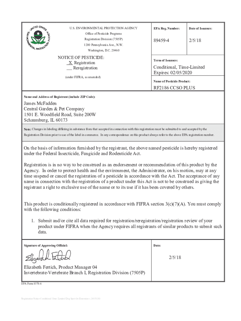 U.S. ENVIRONMENTAL PROTECTION AGENCY EPA Reg. Number:Date of Issuance:8945942/5/18Office of Pesticide Programs Registration Division (7505P) 1200 Pennsylvania Ave., N.W. Washington, D.C. 20460NOTICE