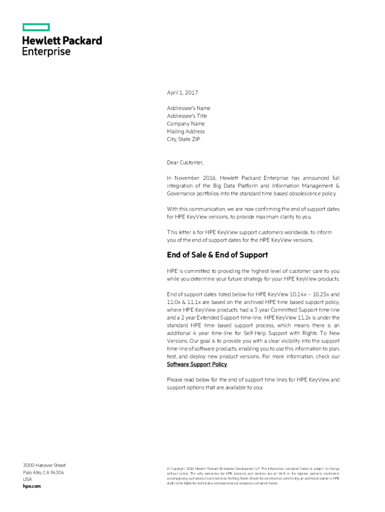 April 1, 2017, Addressee\'s Name Addressee\'s Title Company Name Mailing Address City, State Zippier Customer, In November 2016, Hewlett Packard Enterprise has announced full integration of the Big