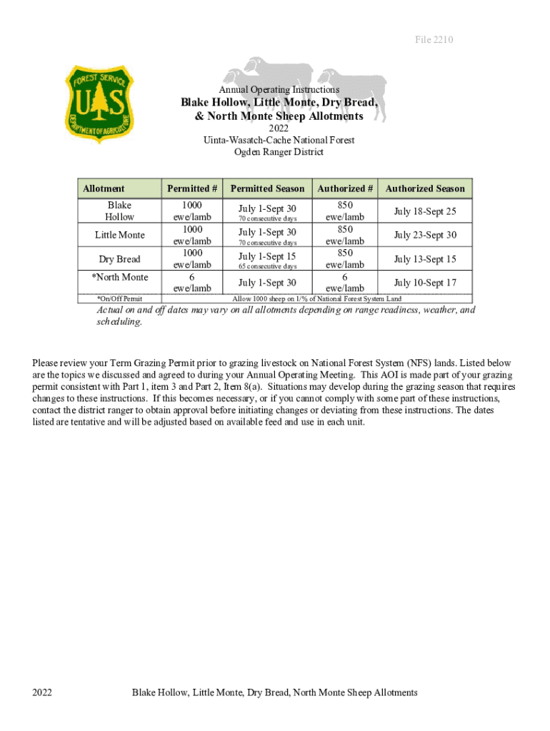 File 2210Annual Operating Instructions Blake Hollow, Little Monte, Dry Bread,