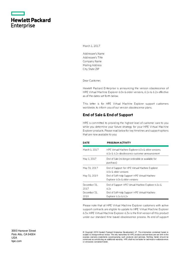 March 1, 2017, Addressee\'s Name Addressee\'s Title Company Name Mailing Address City, State Zippier Customer, Hewlett Packard Enterprise is announcing the version obsolescence of HPE Virtual Machine