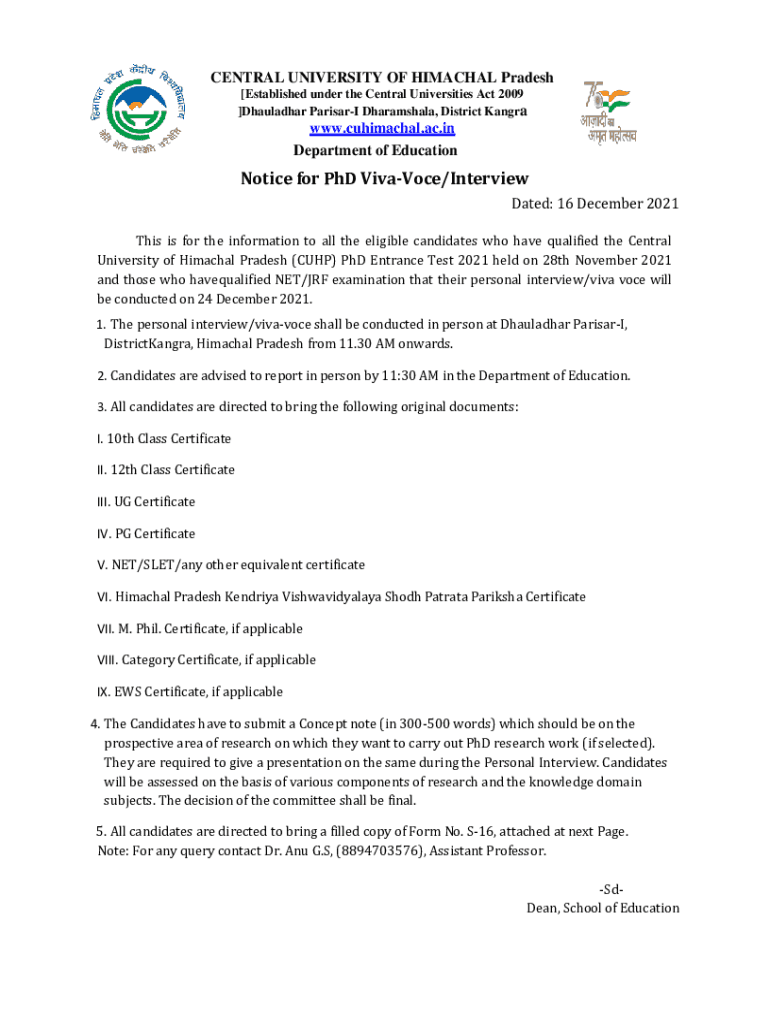 CENTRAL UNIVERSITY OF Himachal Pradesh [Established under the Central Universities Act 2009]Tuladhar Primary Dharamshala, District Kangrawww. Himachal.ac.in Department of EducationNotice for PhD Vivace/Interview